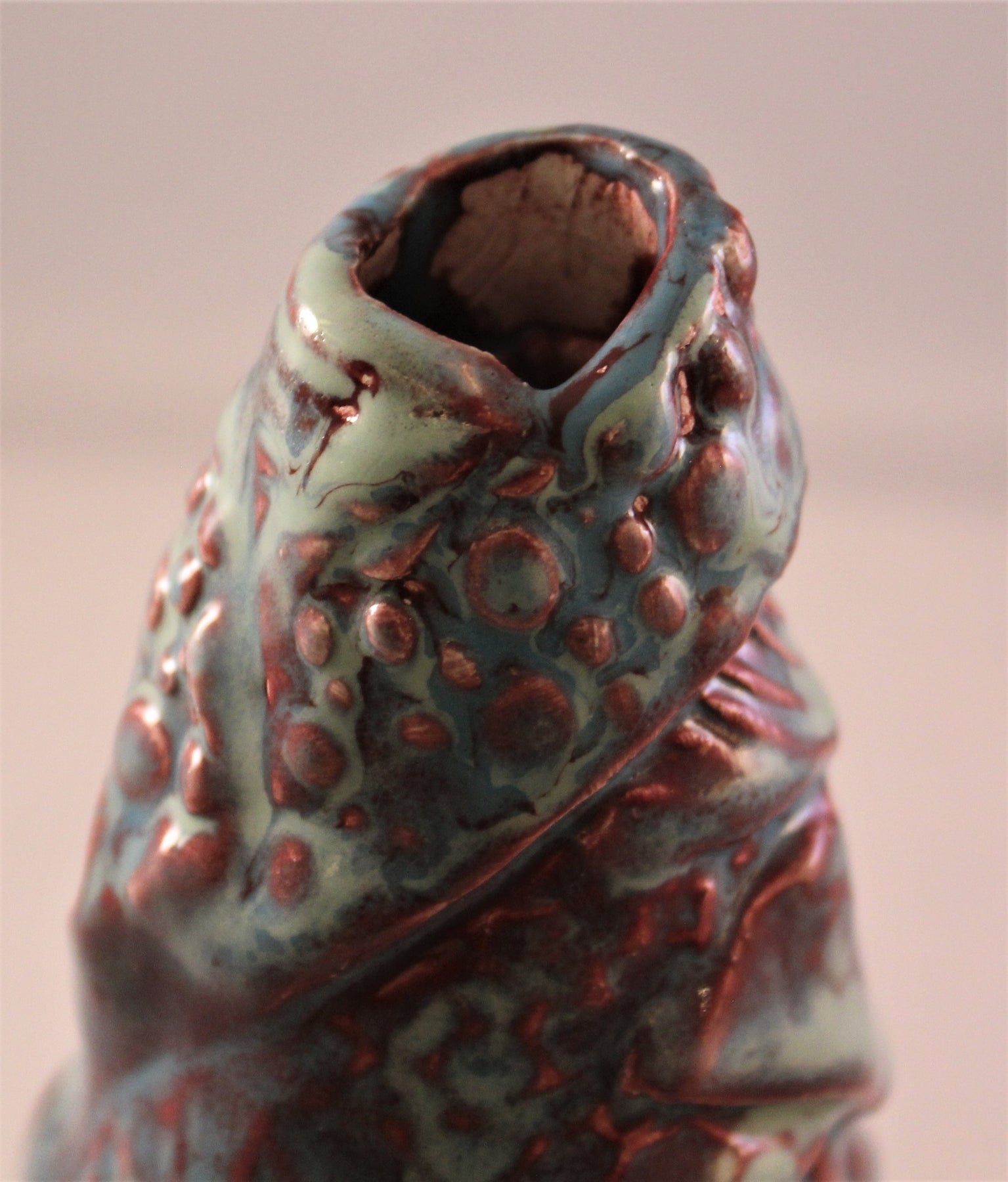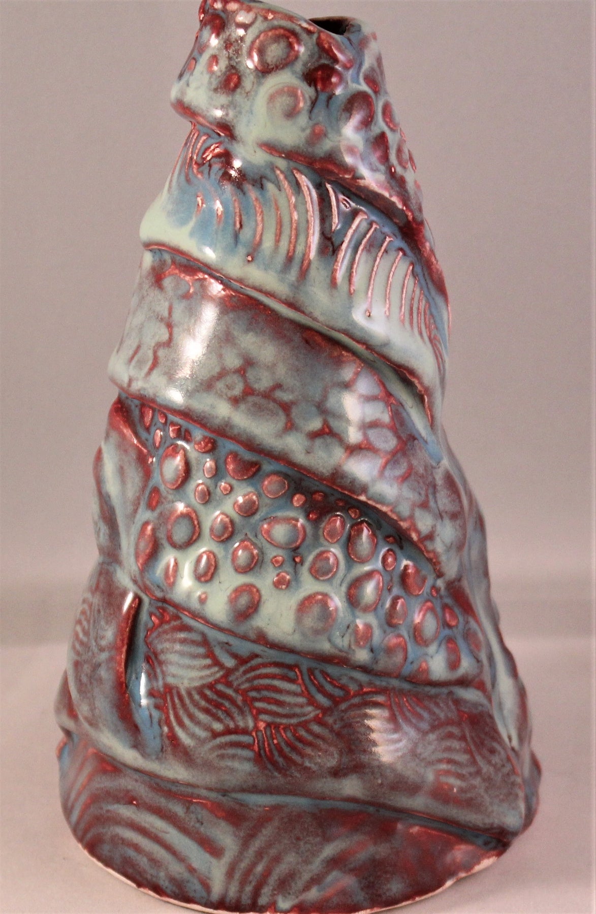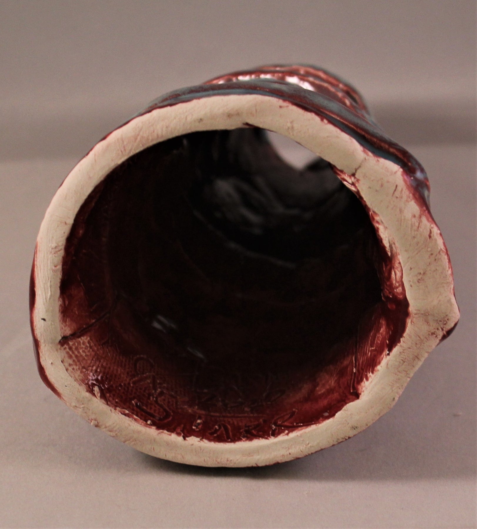 Varying texture makes this artwork quite unique. Hollow inside with a hole on top and bottom. Blue and Burgundy glaze adorn this piece. Signed by the artist. Dated: 2020
